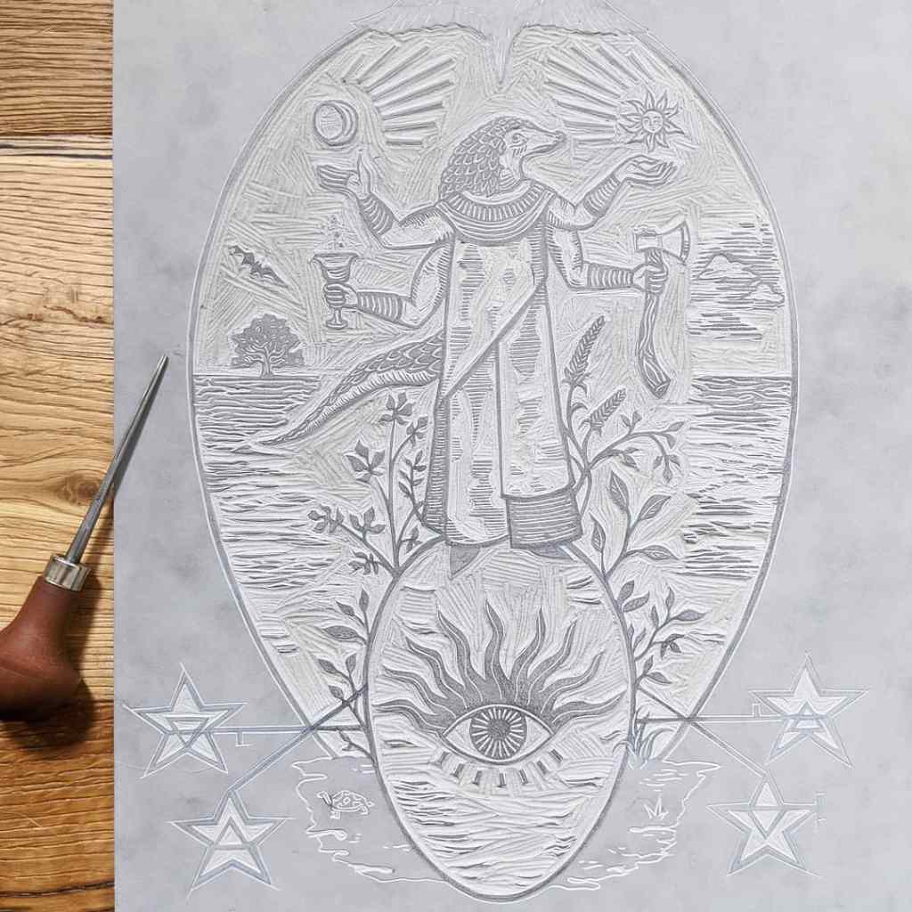 Alongside the poem, I also created a linoprint artwork in the style of the Azoth prints from the 1600s – I wanted to reference the notion of transformation, and the alchemical nature of this world and how we perceive it.